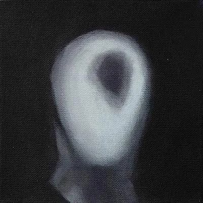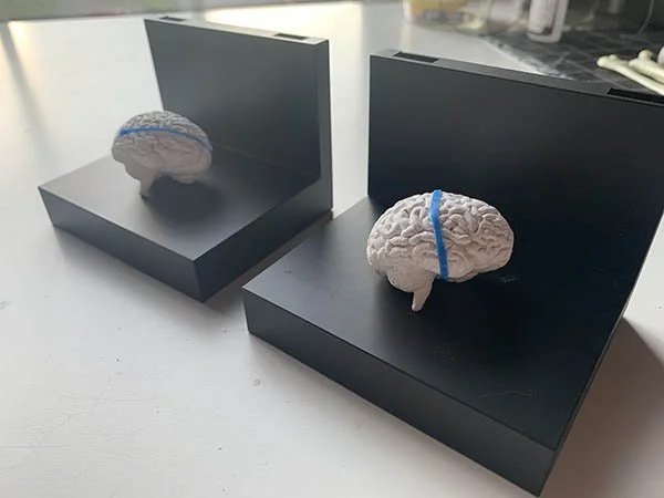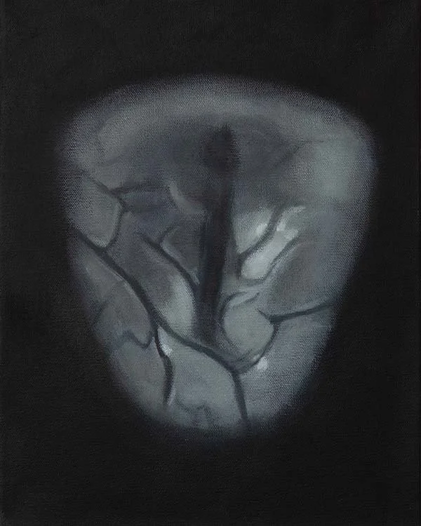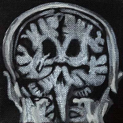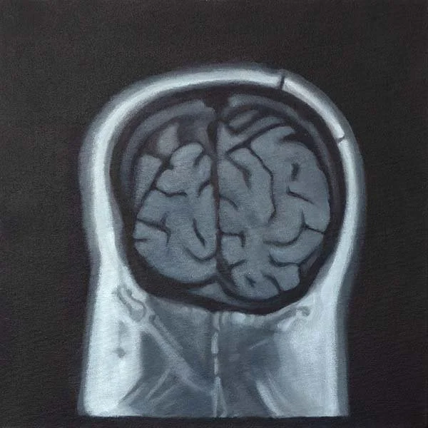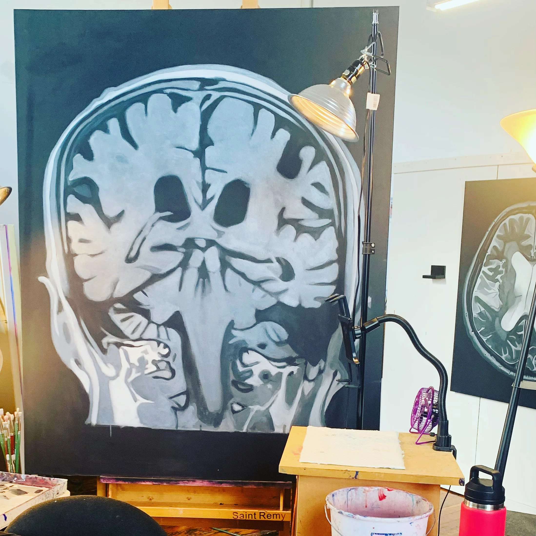 These mini paintings are coronal and sagittal views in which I started experimenting with silver paint. The smaller size allowed me to sketch things quickly and see the effect. These also start to give context to the brain by showing other head features.