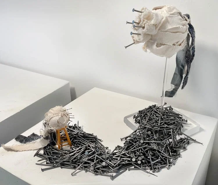 In these paintings, flat photographs are folded and cut using kirigami and origami techniques. The folds in the paper show and hide different parts of the face. The women in the in the yellow series are famous artists, and in the black and white series are figures important to the American womenʼs and civil rights movements.